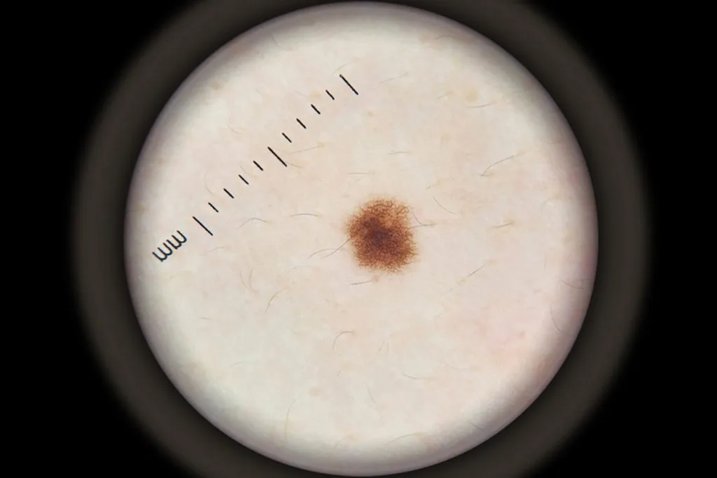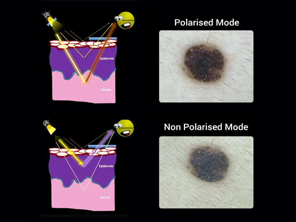 In polarization mode, the polarization filter becomes activated and absorbs the surface light reflection (no immersion fluid required). It allows you to examine the colours, shapes and texture features of the skin lesion more clearly, more precise and more detailed.