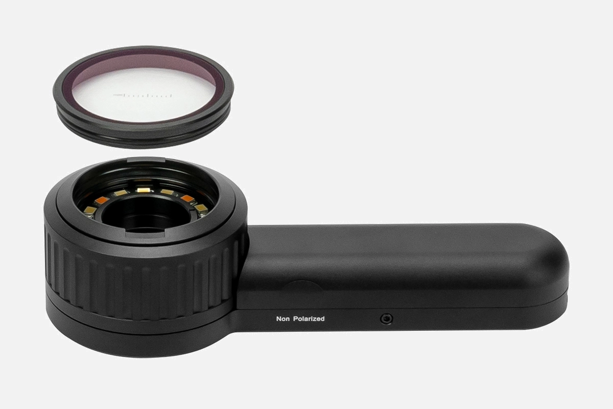 The contact plate has a millimeter scale etched on it. This can be useful for monitoring changes in size overtime or comparing different lesions.