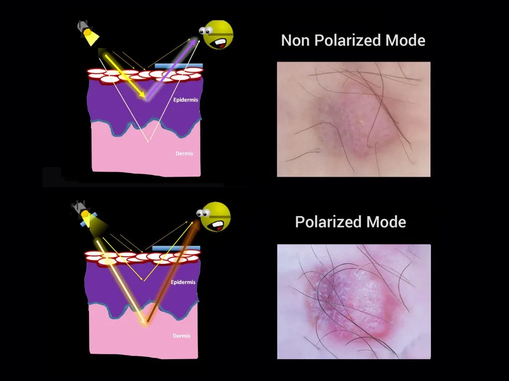 The polarized light can help to eliminate surface reflection and allow visualization of vascular structures. The instrument allows for visualization for deeper skin structures, such as blood vessels, collagen, and pigment in the dermis.