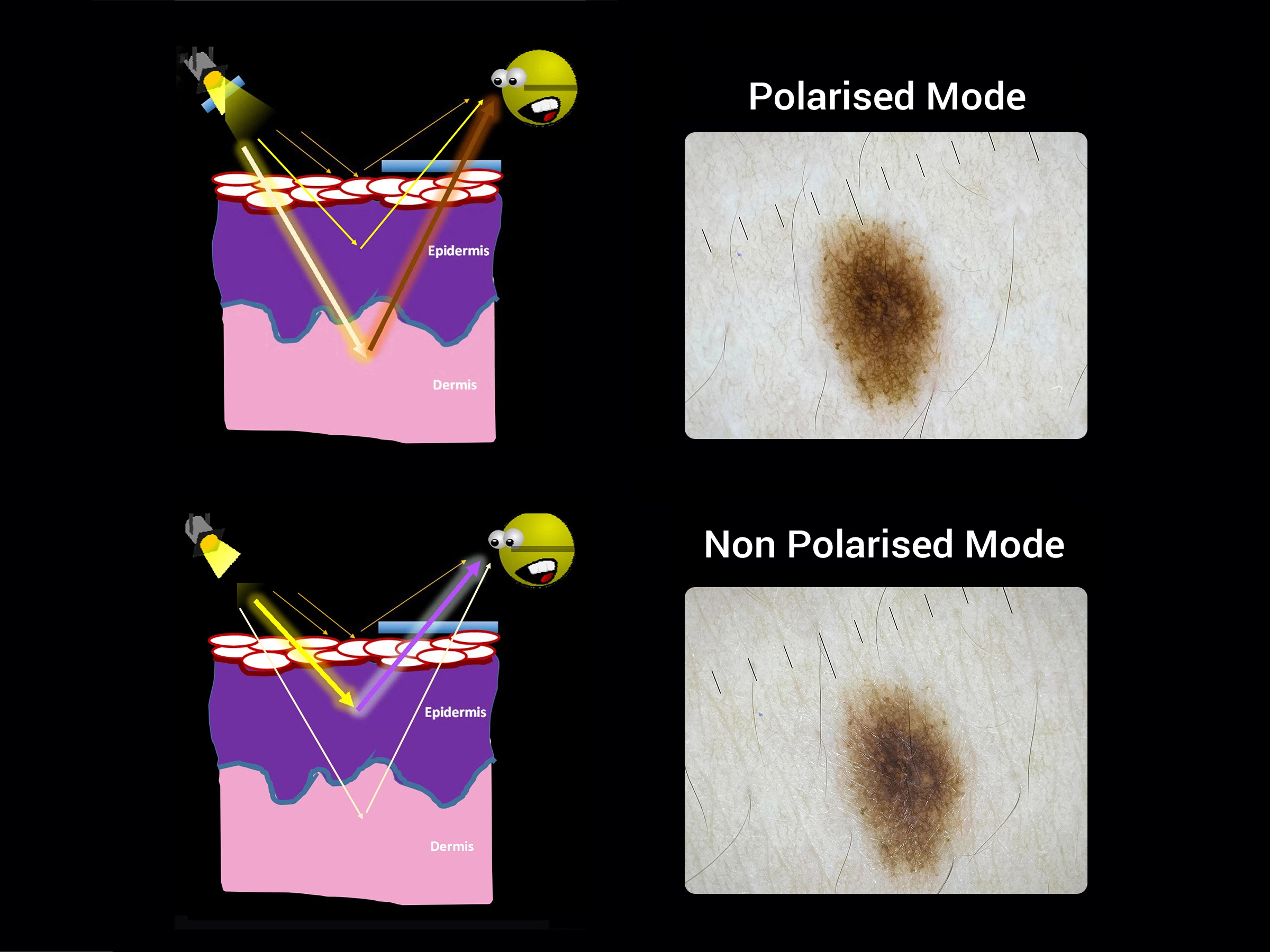 The polarized light can help to eliminate surface reflection and allow visualization of vascular structures. The instrument allows for visualization for deeper skin structures, such as blood vessels, collagen, and pigment in the dermis.
